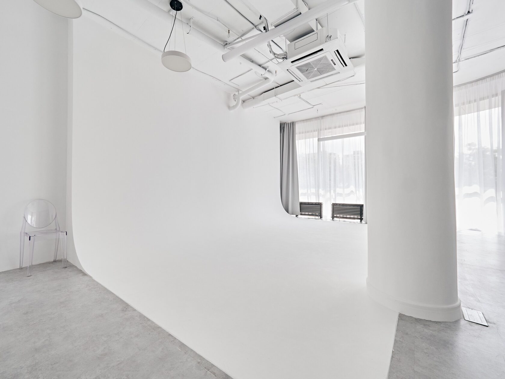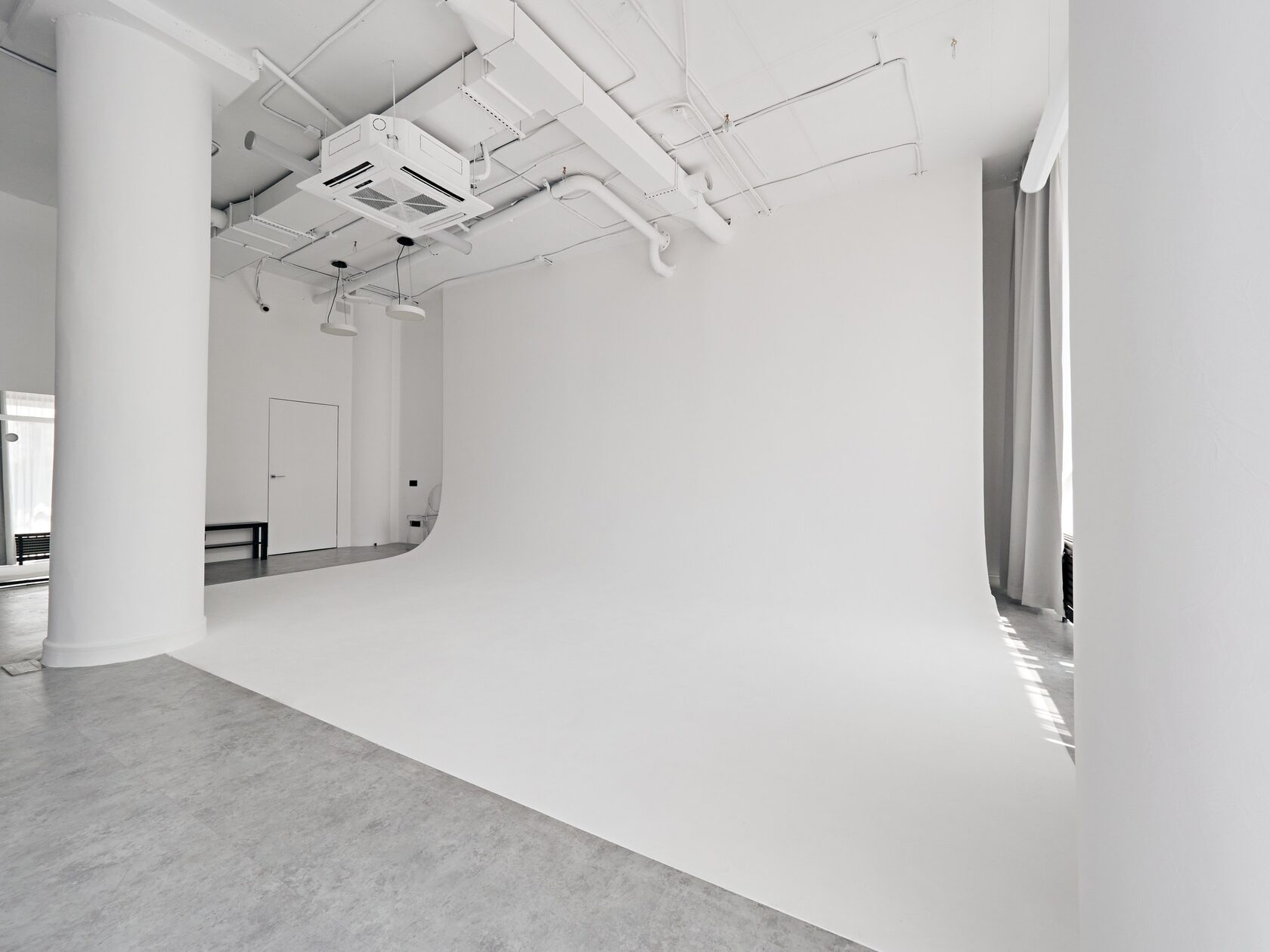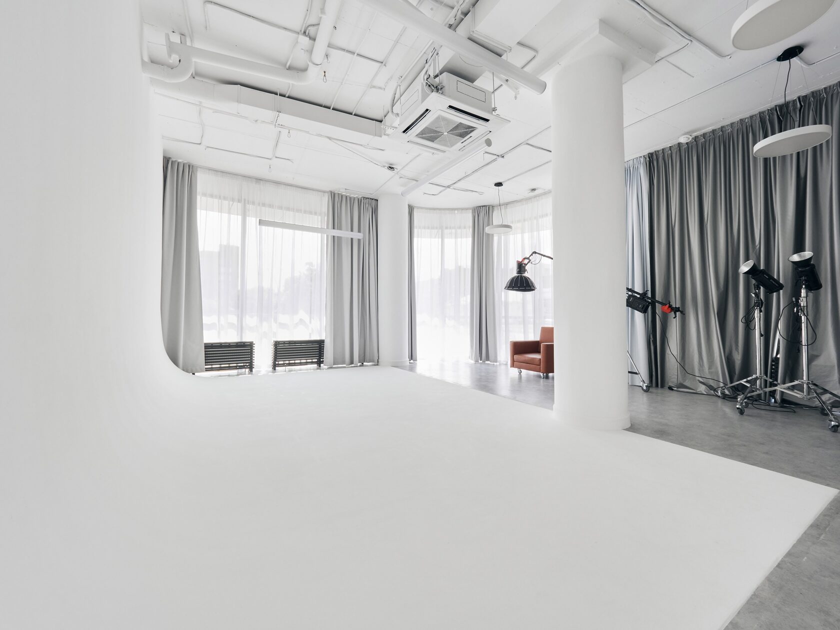Циклорама шириной 6 метров, большое зеркало, 5 анкеров для подвесного реквизита или контента в воздухе, реквизит. Дневной свет от панорамных окон. Большой ассортимент светового оборудования, насадок, фильтров. Держатель для фонов, фоны.