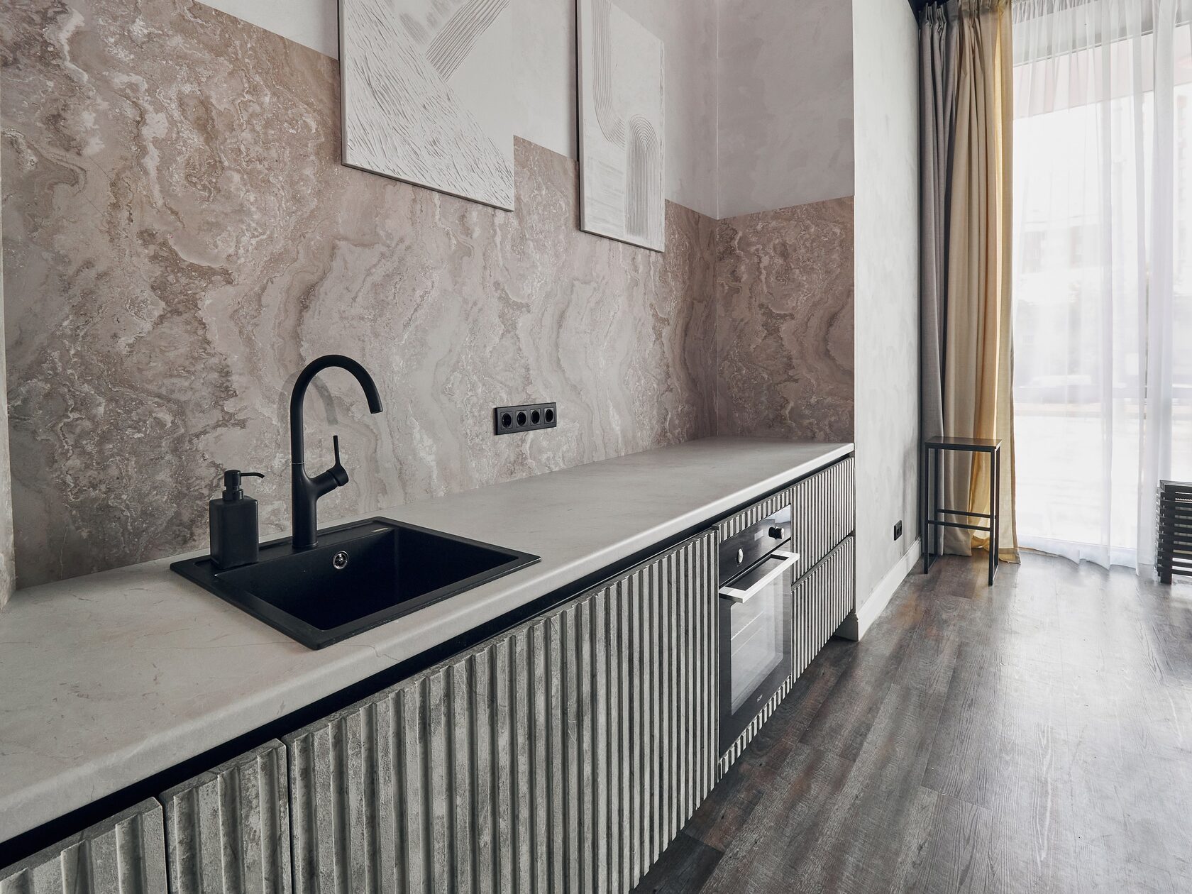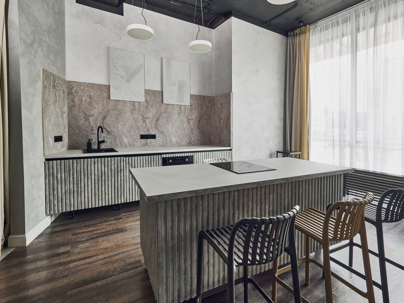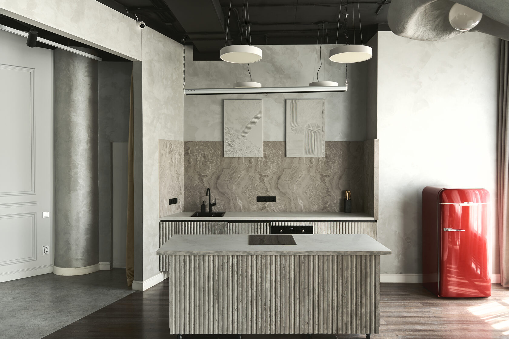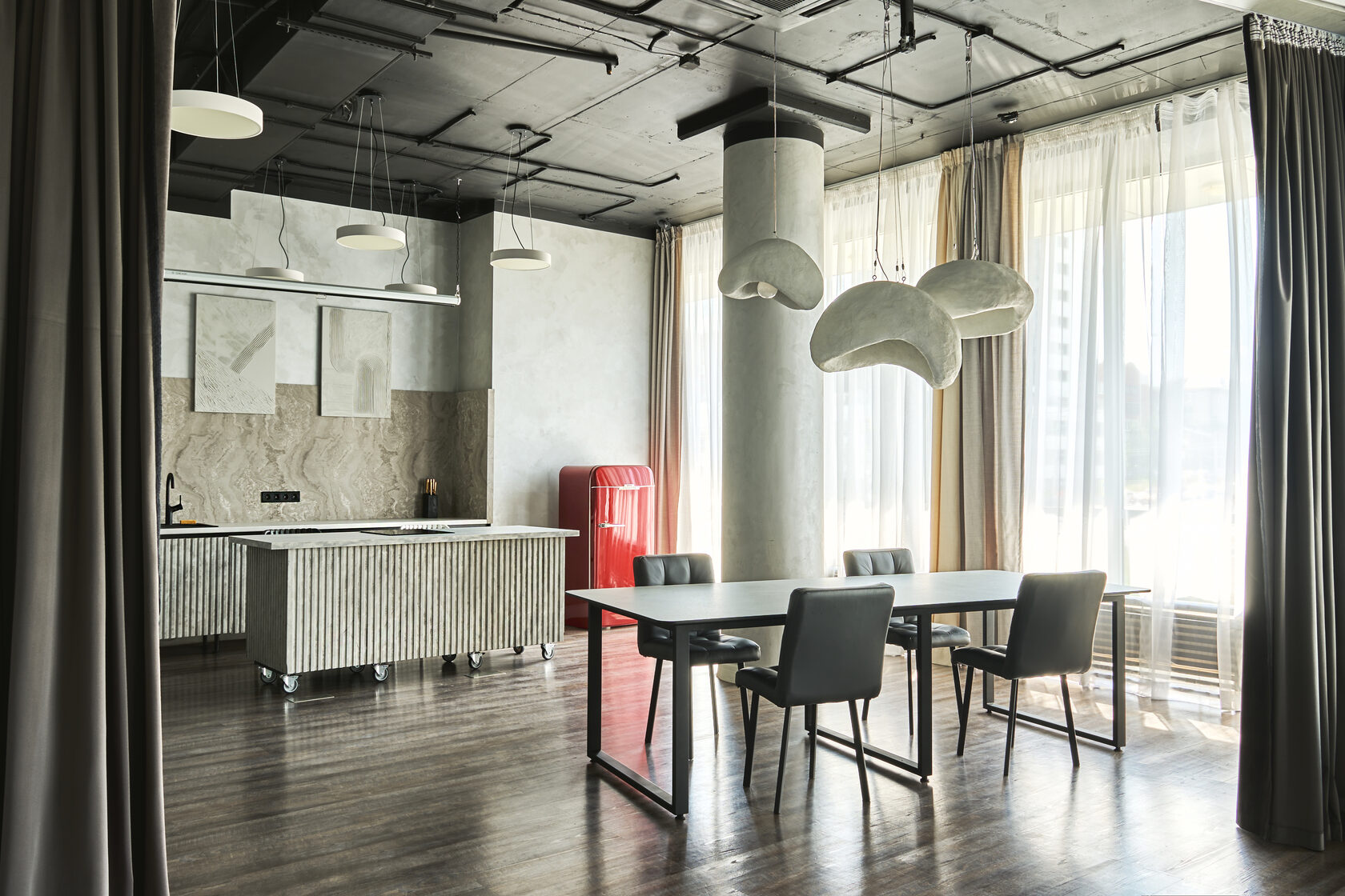 Включается в себя кухонный гарнитур, стол-остров с подключенной бытовой техникой и водоснабжением (варочная панель, духовой шкаф, холодильник, вода), обеденный стол на 15 персон. Интерьерные съемки, подкасты, кулинарные шоу.